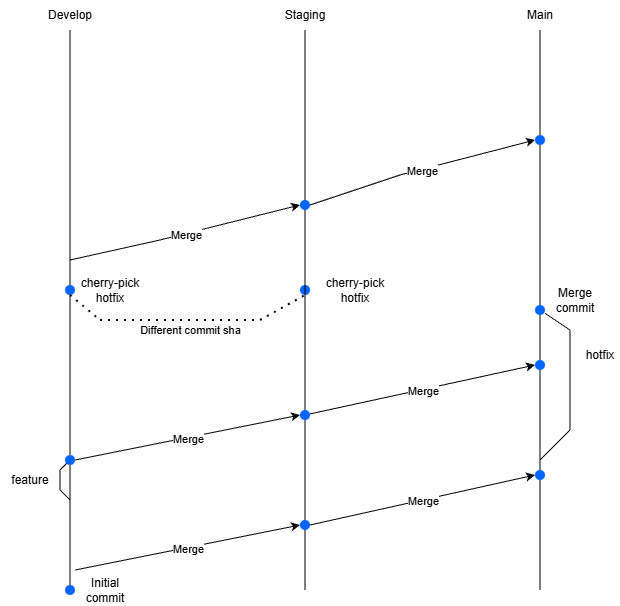 Since I have a DevOps background, I see one big major issue. If I go from develop to main, I create a merge commit, so I can't use the binaries created by the develop branch. A hotfix might be present on the main branch but not yet in develop (since someone was sloppy and the maintenance didn't happen yet). It is very prone to errors. Rebasing does not create a merge commit, but it doesn't resolve this issue. You'll have the sha of the latest commit on develop, but you are uncertain that the develop equals main. You could use the binaries that were last created by your develop build in theory, but it's hard to verify if that's the one you want. You can have racing issues, when a develop build didn't finish yet, or a newer one has finished already. You should always try to follow the concept of build once, deploy everywhere. So you don't test binaries on develop, that aren't the binaries going into production. Your dockerfile base image might have gotten a patch, it might create a major issue for you and you will only notice on production.