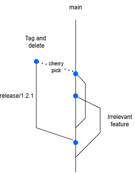 Imagine if we have 3 environments: develop, UAT and production. Develop is our unstable environment, we will just continuously deploy our main branch there. If we want to go to UAT, we make a git tag from the main branch. The git tag triggers a pipeline, if UAT is ok, we approve the next stage of the pipeline and it gets deployed to production. Here, release promotion is easy, the commit sha already exists on main, so we can just move the same binaries from develop to UAT and main.